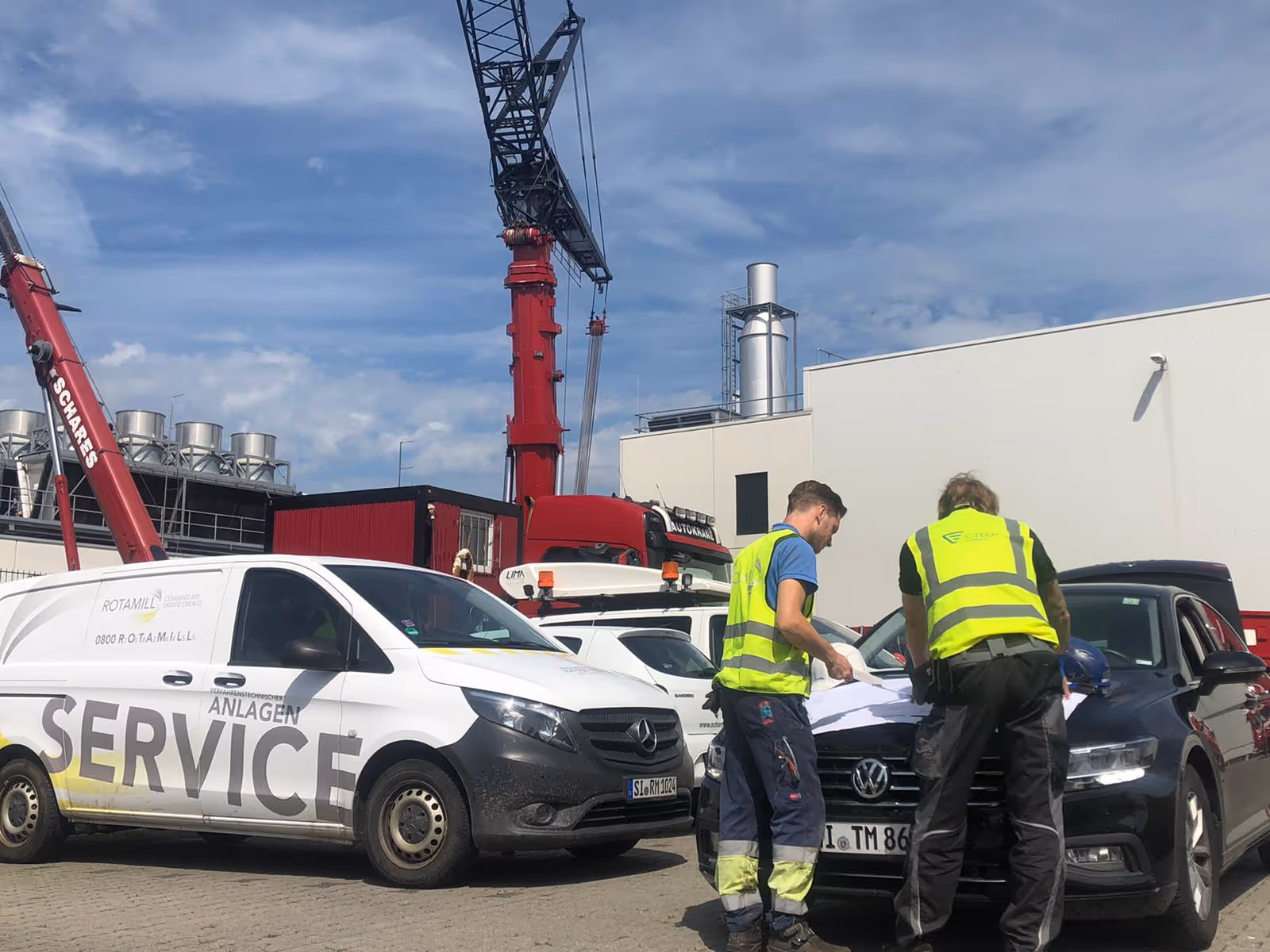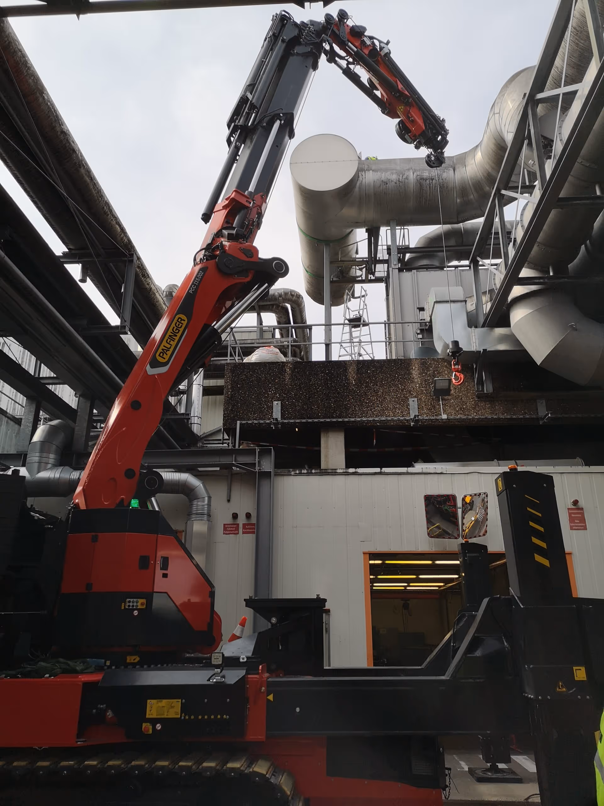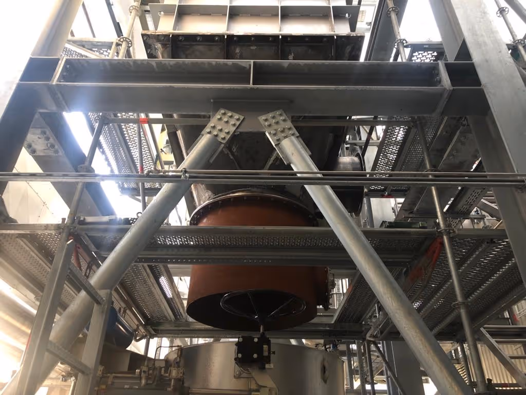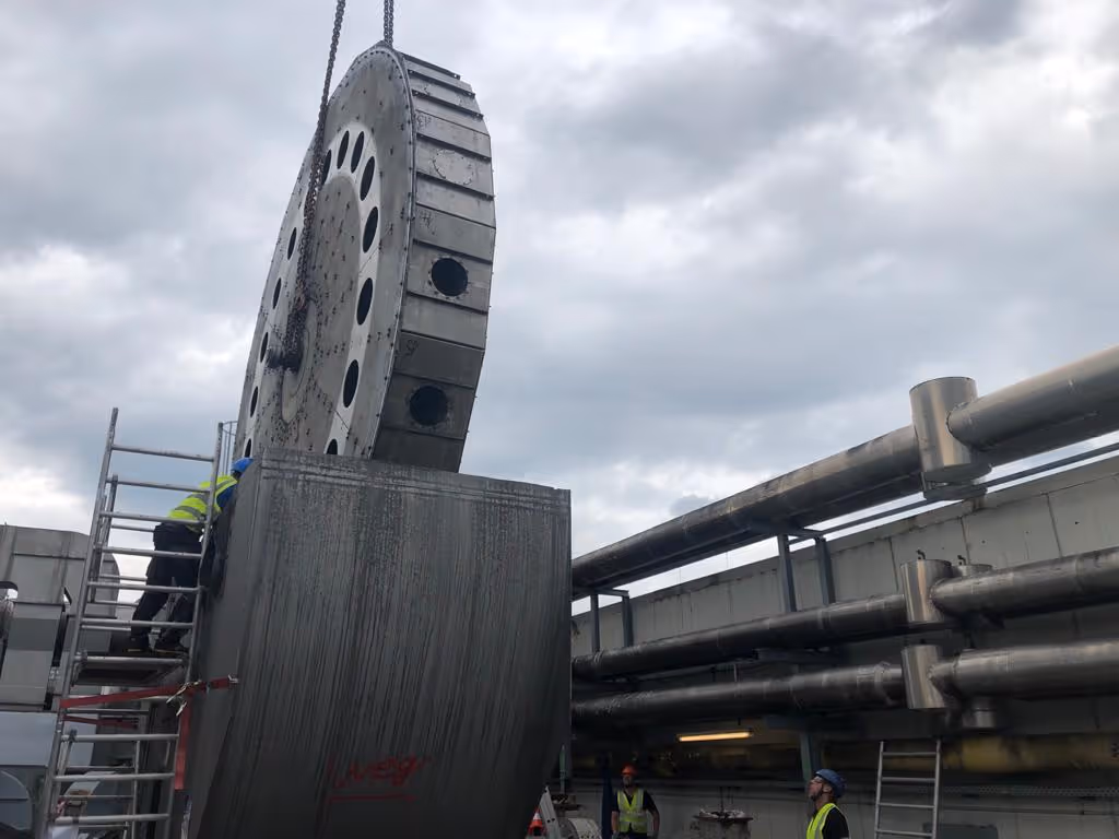 Die RD-Räder (Aktivkohlefilter) hatten ein hohes Eigengewicht und konnten nur mit Großkrantechnik ausgehoben werden. Zusätzlich erforderten enge Bereiche den Einsatz eines kompakten Raupenkrans. Parallel war eine sichere KMF-Entsorgung notwendig.