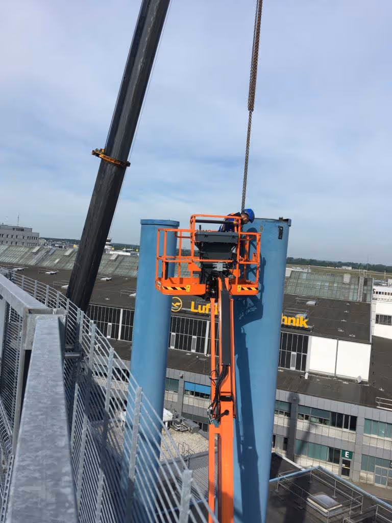 Der Flughafen untersagte sämtliche Arbeiten mit KMF und Asbest auf dem Gelände. Daher mussten Kessel, Leitungen und isolierte Bauteile vollständig im Originalzustand zum Entsorger transportiert werden, wo die Schadstoffsanierung erst erfolgen durfte. Gleichzeitig war ein sicherer Rückbau im laufenden Flughafenbetrieb erforderlich.
