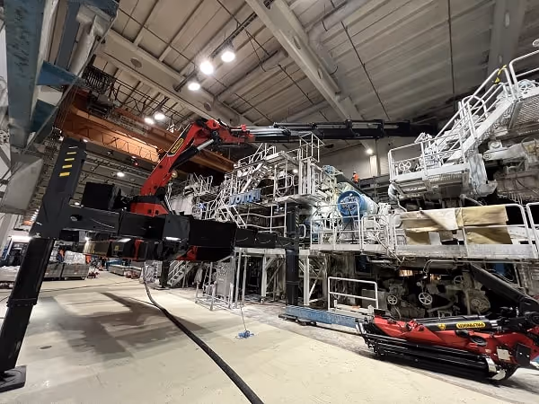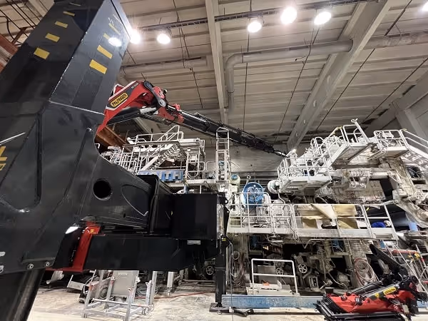 In einer Papierfabrik mussten zwei Kranbahnträger im ersten Obergeschoss ausgetauscht werden. Die jeweils 4 t schweren Komponenten befanden sich direkt hinter einer 7 m hohen Papiermaschine, was den Zugang massiv einschränkte.
